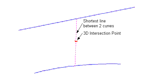 An imaginary line is drawn at the shortest distance between the two curves between two corresponding points on the curves. The length of this line is then compared with the Intersection Tolerance value. If the length of this line is smaller than the Intersection Tolerance value, a point is created in the middle of this line. This point is defined as a 3D intersection point.