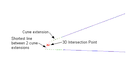If the length of the line is greater than the Intersection Tolerance, imaginary extensions are created for both curves: linear extensions for splines and natural extensions for other curve types. The system then detects the shortest distance between the curve extensions and creates an imaginary line between two corresponding points on the extensions. The length of this line is then compared with the Intersection Tolerance value. If the length of this line is smaller than the Intersection Tolerance value, a point is created in the middle of this line. This point is defined as a 3D intersection point.