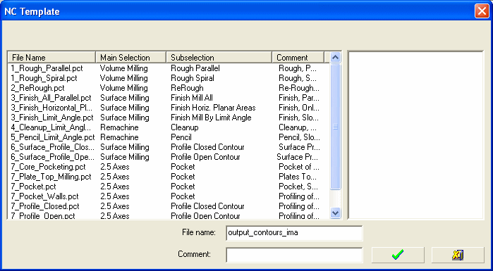 A SimpleSimple version of the NC Template dialog can be displayed by using the Preferences. Go to Tools > Preferences > NC > Environment > Dialogs and select Template - Procedure & Toolpath = Simple. In this case, some of the fields in the dialog are not displayed and all the templates in the default template folder are automatically displayed.