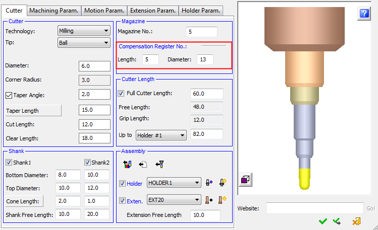 These parameters are only displayed if the Compensation Register Control parameter is selected in the Preferences > NC > Default Values and can only be used by appropriate Post Processors.