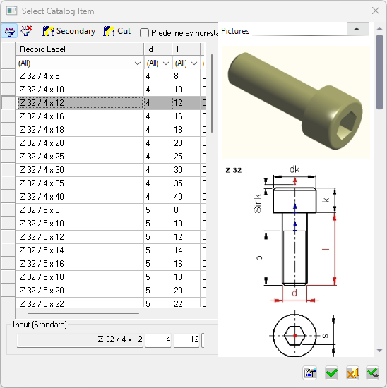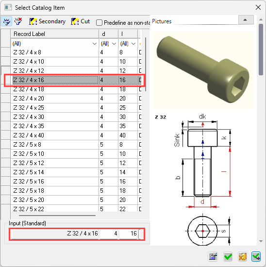 When you press Edit Parameters, the Select Catalog Item dialog is displayed with the original component parameters highlighted.