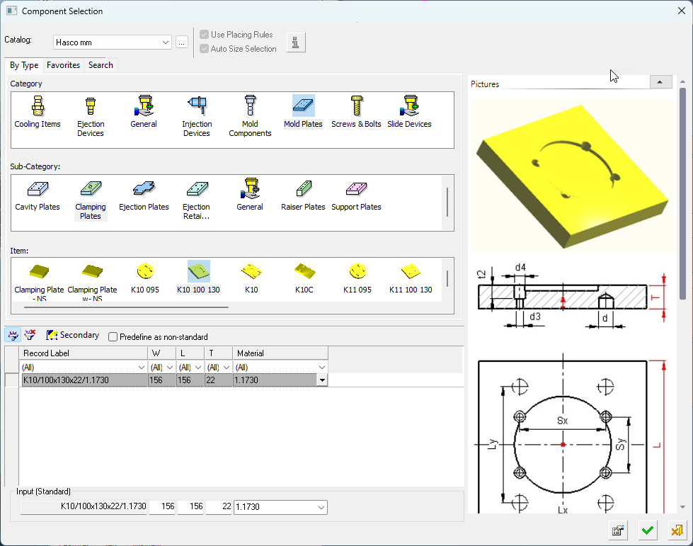 See the Add Mold Parts function for a description of this dialog and how to select the size of a component from the catalog.