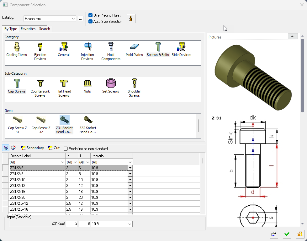 See the Add Mold Parts function for a description of this dialog and how to select the size of a component from the catalog.