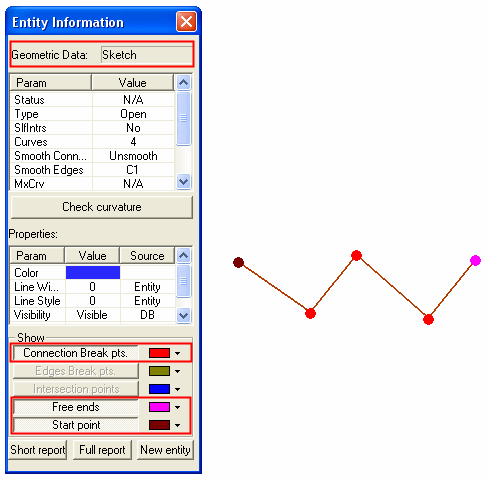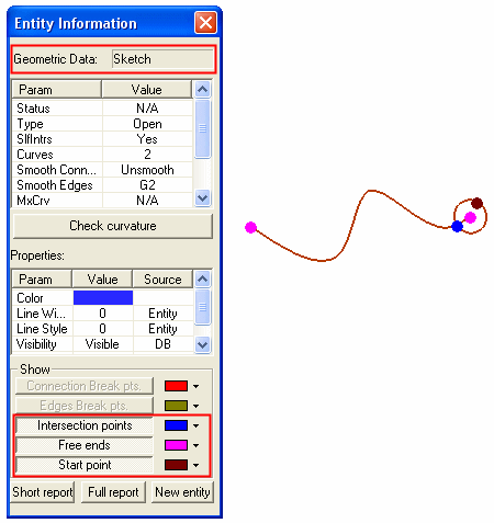 The tool displays geometrical information and detects problematic areas. No geometrical entities are created; all visual information (control points, break points, etc.) are cleared after exiting the function. Entity Information does not use the regular selection filter while entity selection is available in NC after the Entity Information tool is invoked.