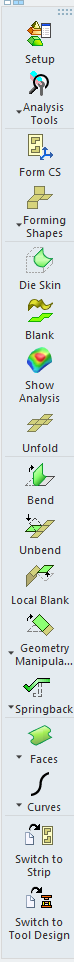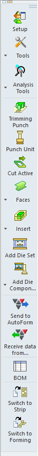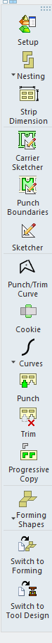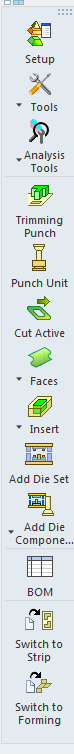 The DieDesign Guide toolbar that is displayed depends on whether you are in the Progressive Die or Transfer Die environments. Each guide allows quick access to all functions that may be useful in the appropriate die creation process.