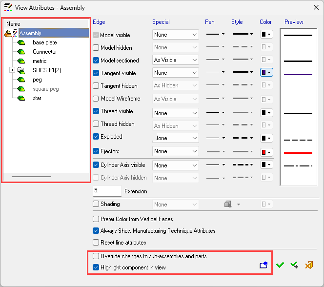 If a view of an assembly is created, the name section of the Assembly Tree is also displayed in the View Attributes dialog and additional options appear at the bottom of the dialog (highlighted in the example below). See Assembly View for an explanation of the additional options in this dialog.