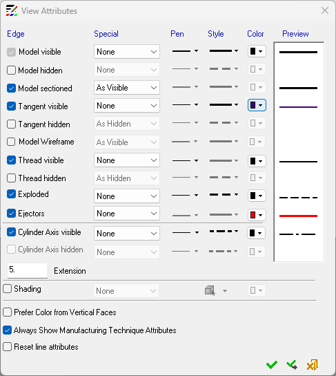 When this option is selected, the Pen, Style and Color attributes become available for that entity. These attributes can also be changed individually for each sheet and view in the menu bar. A Preview column displays a preview of the attribute as it will be displayed with the current settings. When this option is selected for the Shading attribute, the transparency level (Wireframe, Transparent, Shade, and Render Mode) and also the color attribute options are still available. When editing the attribute of an entire view, all faces will be colored in the selected color.