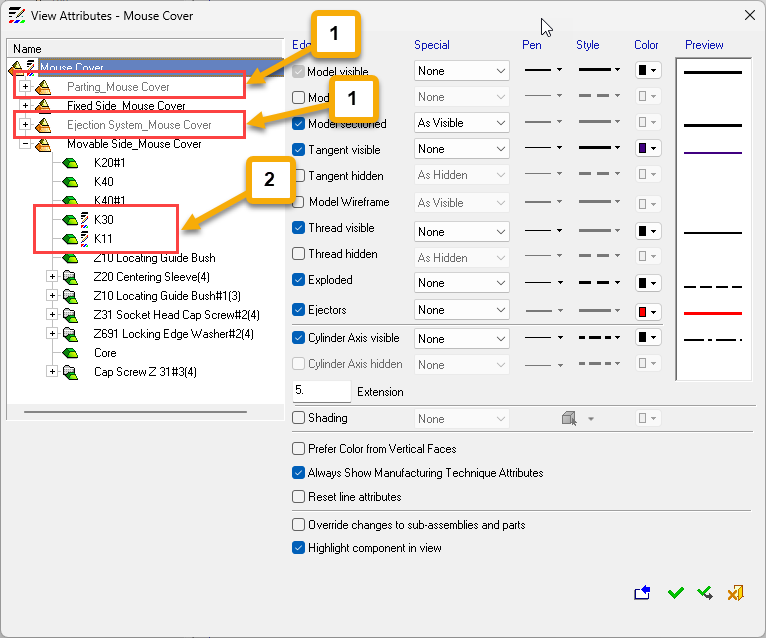 If a view of an assembly is created, the name section of the Assembly Tree is also displayed in the View Attributes dialog and additional options appear at the bottom of the dialog (highlighted in the example below).