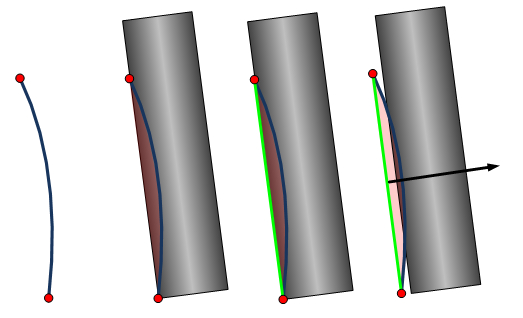 The degouging will push the tool out of swarf surface in case a collision occurs. To avoid the collisions the tool will be pushed away orthogonal to the contact line between to the upper and lower curve.