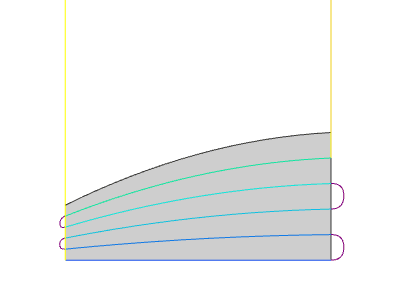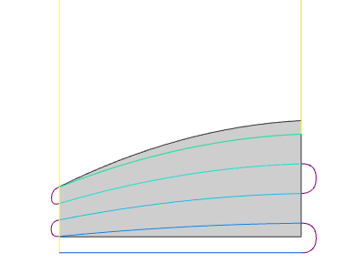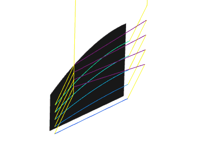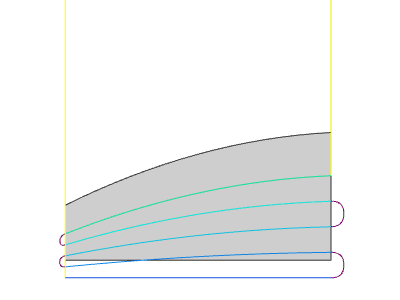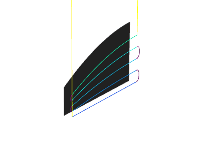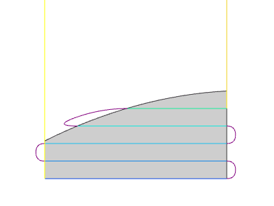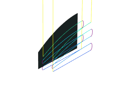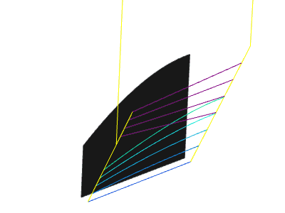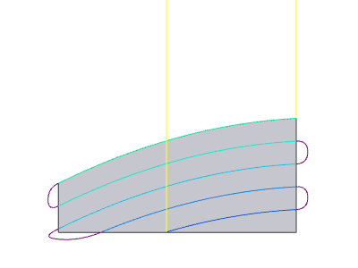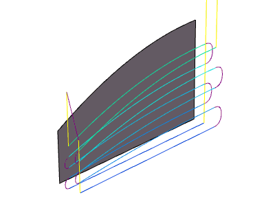 The multiple slices are copies of the initial slice. The 'copy' direction will can be defined by 2 directions. They can either be along the tool axis or along the contact line. In case that a conical tool is being used, a retraction along the tool axis is not applicable. The tool would leave the surface in the upper cuts due to the conic angle. In this case the option 'contact line' should be used.
