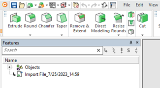 All features created in your file appear in the Feature Tree. The first item in the tree is Objects which is empty until you create at least one object.