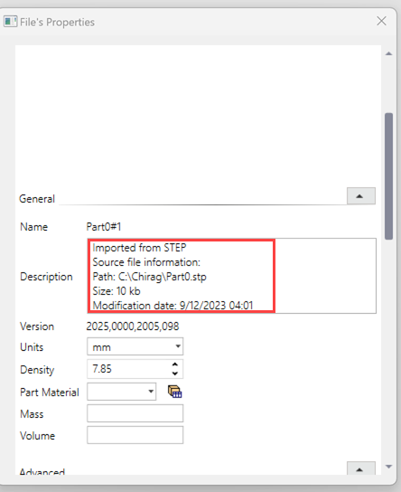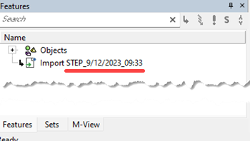 A timestamp is appended to the name of an imported part file in the Feature Tree. The timestamp consists of the date and time of the import translation (separated by an underscore) using the region settings 'short date' format set up on the users system.