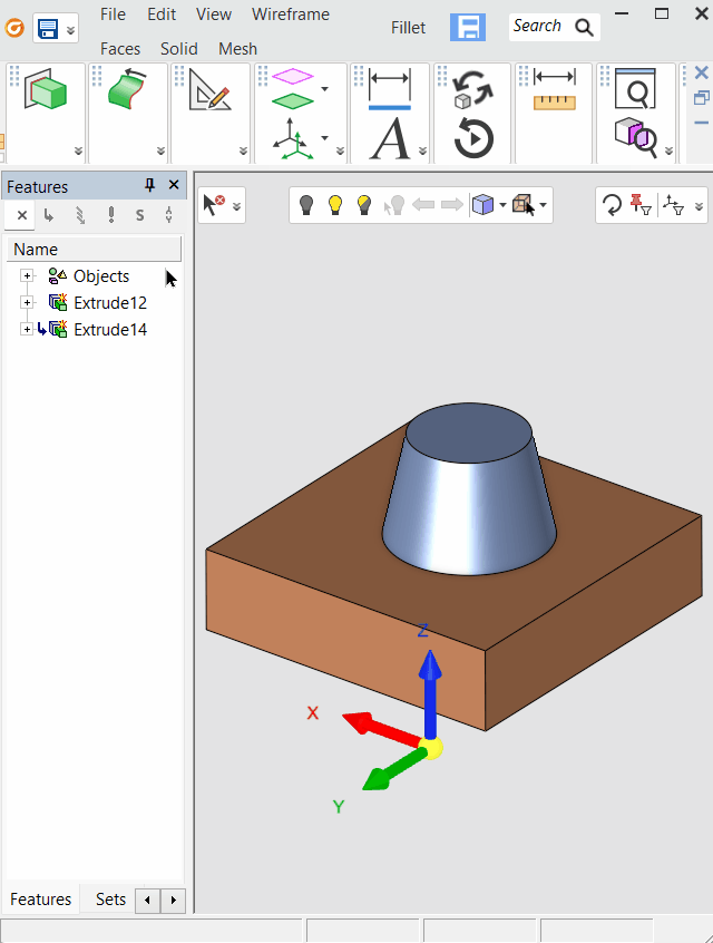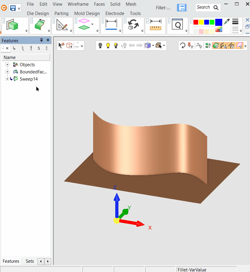 Create fillet faces between two (2) sets of smoothly connected faces. Each set may consist of one or more faces that may be trimmed or split as required. Sometimes it can be unneccessary to trim or split faces when performing a fillet operation, such as when one face will be needed later in separate face operations-The fillet operation provides that option.