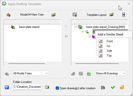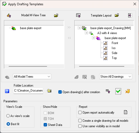 After invokinginvoking the function, the Apply Drafting Templates dialog is displayed; some of the dialog options that are available when invoking from Export to Drafting are not available when invoking from Create Sheet from Template.