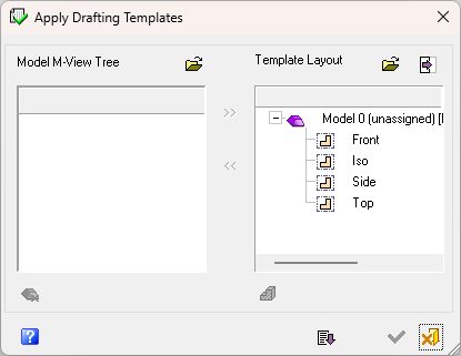 The Model M-View Tree pane (on the left side of the window), displays the tree of active (or selected) model's M-Views. From the Export > To Drafting function: When the dialog is invoked from the Export > To Drafting function, this pane (left pane) automatically displays the active model view tree, as displayed in the M-View tab of the parting file view tree. From the Create Sheet from Template function: When the dialog is invoked from the Create Sheet from Template function, this pane (left pane) is initially empty until you select a model. To select a model, click Open |
