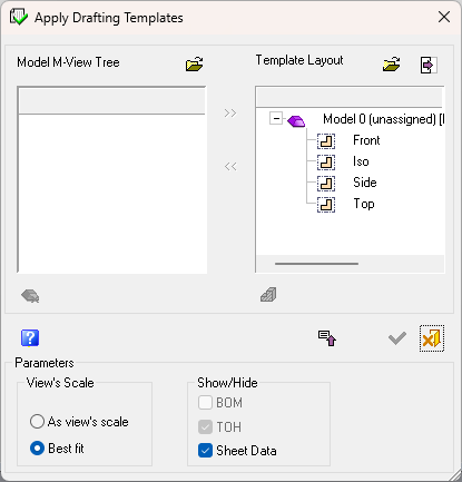 The Template Layout pane (on the right side of the window), contains the layout that exists in the previously assigned template selected in the Drafting Templates dialog (from Export > To Drafting and Create Sheet from Template). This assigned template outlines, for example, the number of views defined in the template and also the TYPE of template (Sheet or Drawing template).