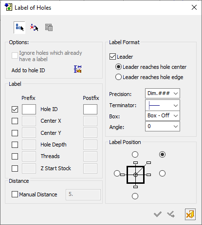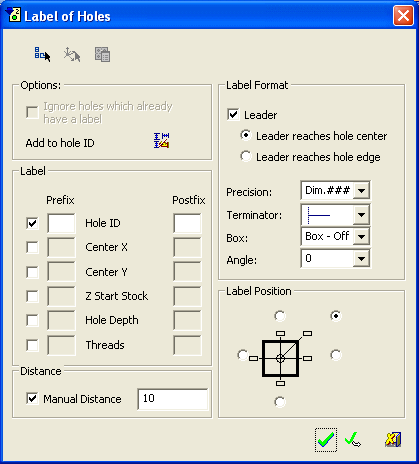 InvokeInvoke the Automatic Label of Holes function. The Label of Holes dialog is displayed, as follows: