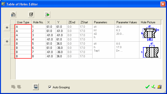 If a Table of Holes is defined with the following User Types,... ...and the Column Chooser dialog is set as follows: ...the Label of Holes may look as follows: