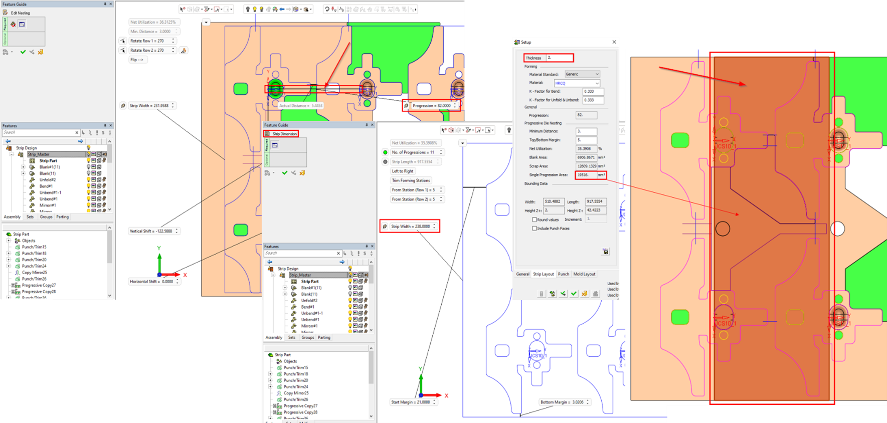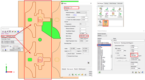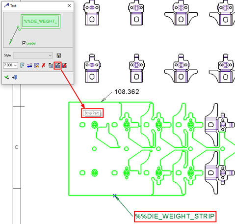 This capability uses two symbolic text fields as placeholders on the sketch, DIE_WEIGHT_PART and DIE_WEIGHT_STRIP to show the weight of a part or of the strip per progression, based on the values held in the Strip Layout tab of the Material Standard database