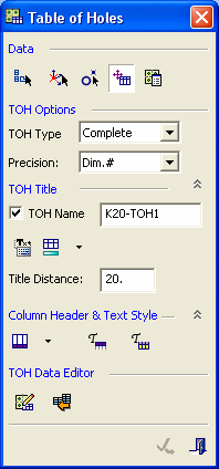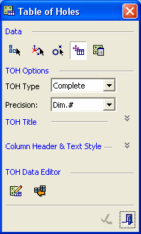 When the TOH function is invokedinvoked , the Table of Holes dialog is displayed to guide you through the table creation and editing stages. The example dialog below is displayed in collapsed (default) and expanded modes (also, all the options and buttons are displayed here as available at the same time - this is for clarity; the TOH Type dropdown option is unavailable when editing a table of holes.