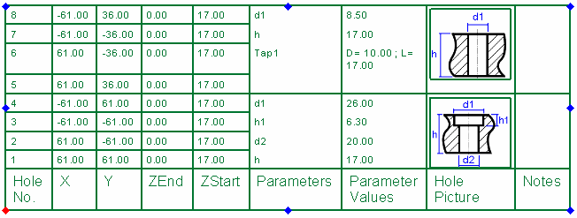 Specifically, for each hole, the columns represent the hole number, the X and Y coordinates, the Z start and Z end coordinates, any parameters that may be attached to a hole (such as height and depth), values for these parameters, a picture representing the type of hole - for example a through hole (if the hole is defined), notes or comments, and a user type or user-defined name for a hole. For example: