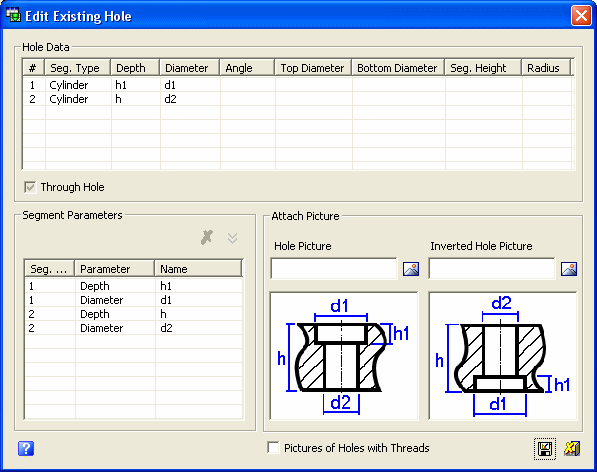 Edit existing holes in the Table of Holes. This includes editing hole parameters, editing names, attaching different pictures, and more.