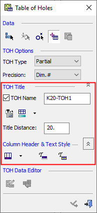 After a Table of Holes has been created, the Table of Holes dialog can be used to change the table appearance, using the highlighted options: