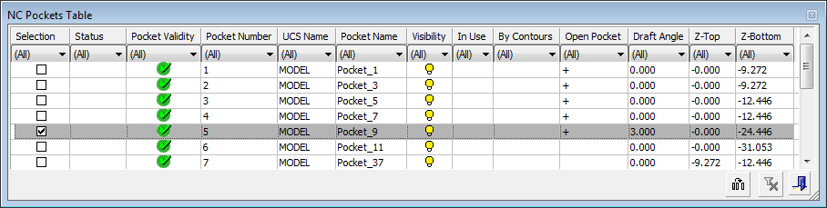 Pocket Selection dialog: Use the dialog selection controls - Select all Displayed Pockets and NC Pockets Criteria.
