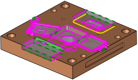 Recognition of all pockets in a Plate is a preliminary step for automating the process of pocket machining. The recognized pockets can be used in downstream procedures and templates. The relevant geometry from the Pocket feature is automatically selected by the procedure. For example, the Volume Pocket procedure takes the pocket’s volume, the Finish procedures take the surfaces and the Profile procedures (Profile Closed Contour and Profile Open Contour) take the contours and Z values. |