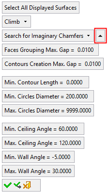 The angle range values beyond which chamfers are not taken into account when the system searches for geometry from which to create contours. If Min. = 44 and Max. Chamfer Angle = 46, then the system detects designed chamfers within the range of 44° to 46°. See Angle Limits, below. |