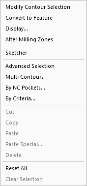 The following popup menu is displayed by right-clicking in the graphics display area while the Contour Manager is active. The contents of the popup menu depend on the operation selected in the Contour Manager. Some of the options are disabled (grayed-out) until you have picked a contour. See also NC Popup Menus.