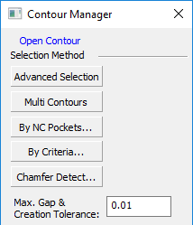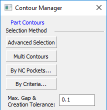 The NC contour creation methods available under the Selection Method section of the Contour Manager dialog, enable you to create contours quickly and also provide a level of automation and control over the type of contour created.