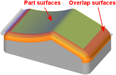 Overlap surfaces define the area where the milling is to be performed at the point at which differing toolpaths meet. They create overlapping adjacent faces and blur the milling borders of adjacent local operations.