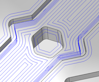 The image below shows tool motions on a pocket floor, interrupted by a hole. |