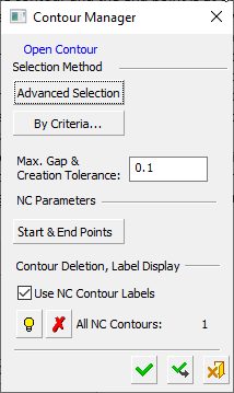 Manually select a contour. This opens a limited Contour Manager. Only one contour can be selected. Define the Start and End points. When editing a procedure that has contour defined, that contour is used and the spun silhouette is not re calculated (unless the Reset Defaults is clicked). |
