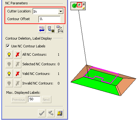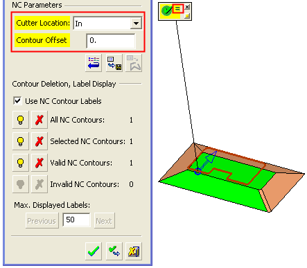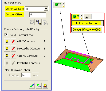 As this contour was previously created using the parameters shown above, if any of the parameters in the NC Parameters section of the Contour Manager dialog are subsequently changed (in this case the Cutter Location has been changed from On to In), the label |