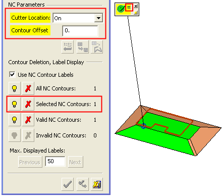 The parameters of the contour are displayed in the dialog and the label and the parameters in the dialog are highlighted in yellow to indicate that they can be edited. Notice that the dialog displays that only one NC contour is selected. |