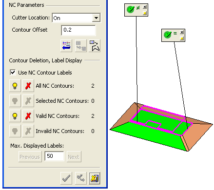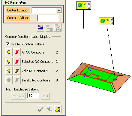 Note: The reason why one of the labels displays an =, is simply because this NC contour was selected first and, initially (until the second contour was selected), the parameters of the first selected contour were displayed in the Contour Manager dialog and hence they were the same. |