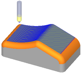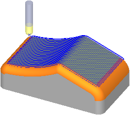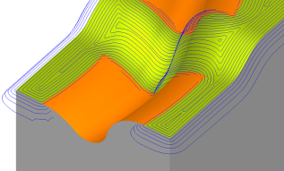 A spiral toolpath over the green surfaces including the waterfall effect. |