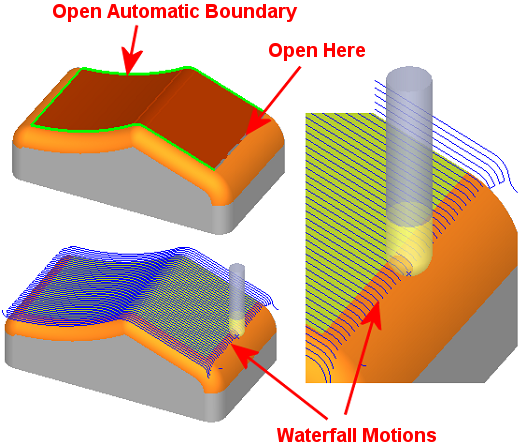 Important: Automatic Boundaries and the exact location of the relevant edges are essential for the prevention of Waterfall motions and also for the Horizontal Machining Expansion calculations (for overlaps and extensions).
