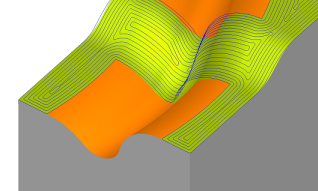 The Waterfall effect occurs when the tool rolls over an outer edge of the selected geometry and falls behind it. The effect reduces the sharpness of the edge and leads to longer machining times. Cimatron offers a high degree of accuracy in automatically creating finished toolpaths that prevent the waterfall effect, whereby the tool moves all the way to the edge of the part, without rolling beyond it. The system automatically defines those edges and you have the flexibility to modify them if required.
