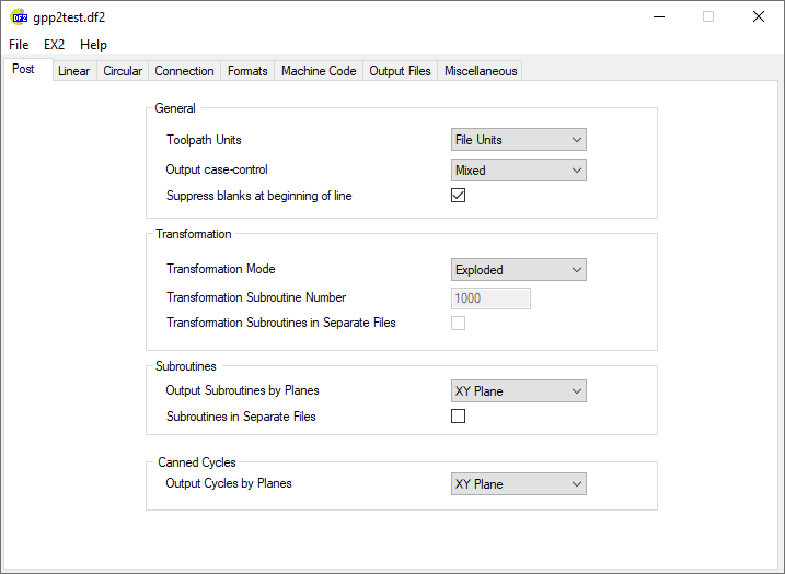 This tool is used by GPP2 developers to edit a definitions file, also known as the DF2 file. This file contains many definitions that affect how GPP2 interprets and executes the EX2 program file. It allows fine tuning of the output machine code (generally referred to as "G-Code"), the formatting of numbers, the way GPP2 handles various motions, etc.