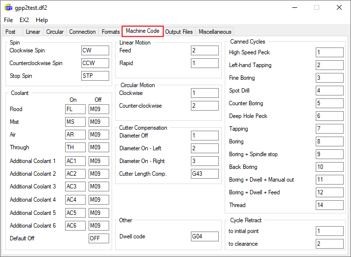 The DF2 configuration file contains a large set of parameters used to define how GPP2 operates in a given post-processor. Many of these parameters have associated system variables that can be accessed or modified in the EX2 program. These variables can also be used in the post-processor interaction in order to allow the end-user to change some of the values.