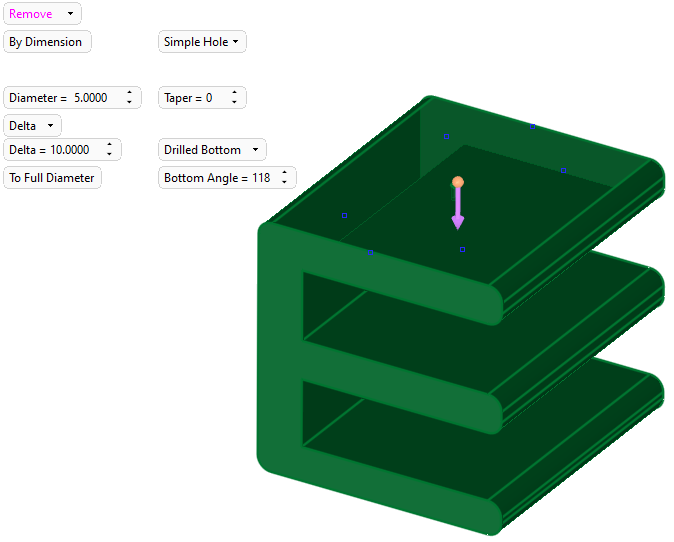 The configurable parameters are the same for each operation; After the target surface is selected, the Remove operation will default to create a hole towards the surface and into the material, whereas the Add and New operations will default to operate away from the surface.