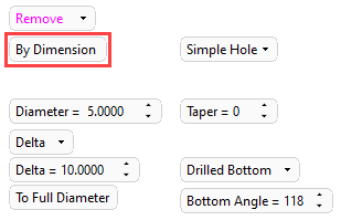 To manually set the hole parameters, select By Dimension. The appropriate parameters are available for configuration. For more, see Hole: Options and Results - By Dimension.