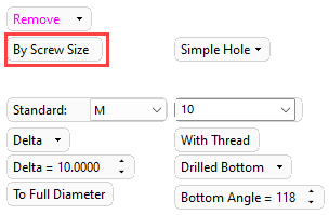 To use a configured list of fasteners, select By Screw Size, see By Screw Size. The appropriate parameters are available for configuration. For more, see Hole: Options and Results - By Screw Size.