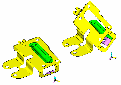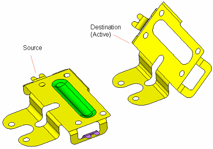 In the assembly example shown hereexample shown here, the purple and the green set of faces can be copied from the Source (Reference) part to the corresponding place in the Destination (Active) part