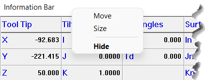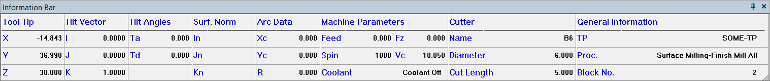 The NC Information Bar is a table that shows the status of the cutter as it moves, and is useful when checking and editing cutter motions.