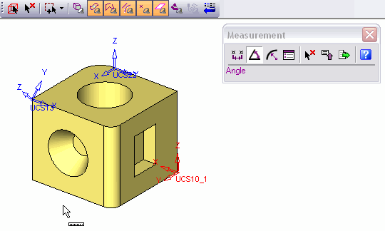 Cimatron provides various combinations for measuring angles. Examples include the angles between the UCS to Axis, UCS to Plane, Plane to Plane, Axis to Axis, and so on.