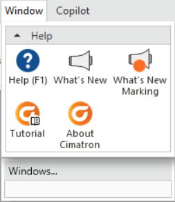 This menu section lists all currently open Cimatron windows. From this list, you can select the active window (the window you want to view). |